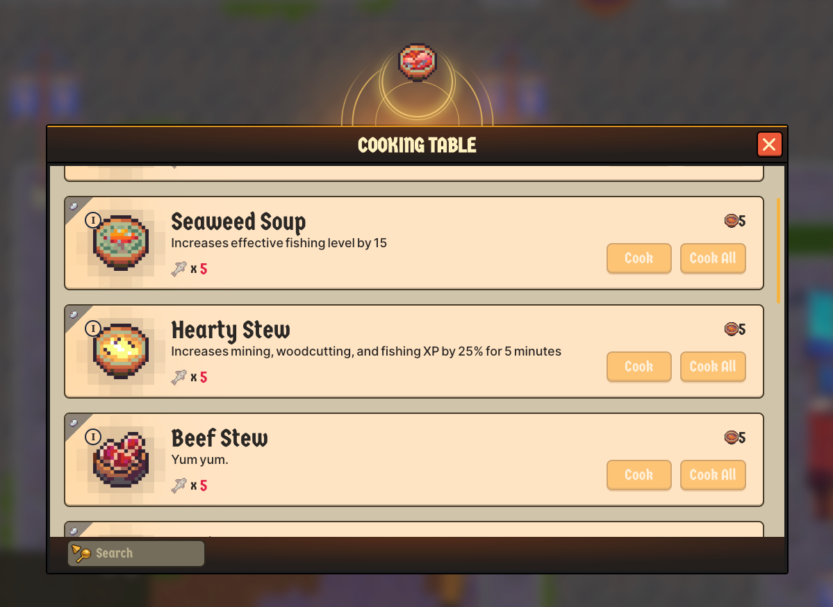 Certain cooking items may require a higher Cooking Level to cook. These requirements can be found in the top right corner of each Cooking recipe.
