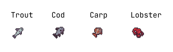 Fishing spots throughout the map allow players to catch fish. To fish, you will need a Fishing Rod, obtainable from the General Store in the City Center.